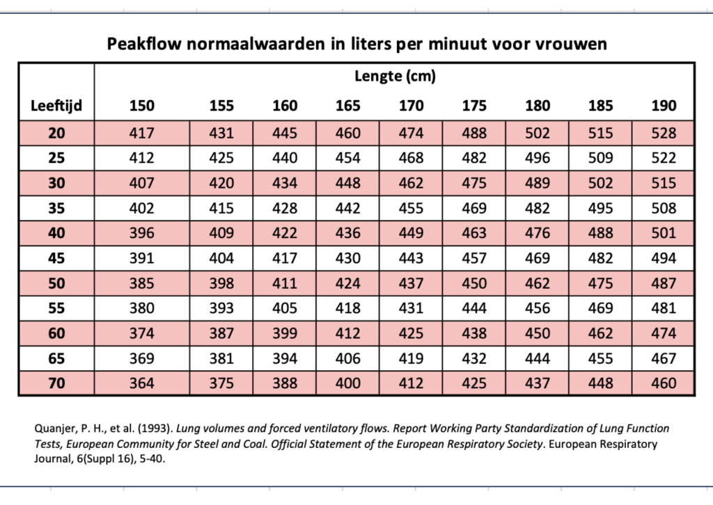 In onderstaand overzicht zie je een richtgetal voor wat normaal is bij een bepaalde lengte/leeftijd. Bedenk daarbij dat ieders peakflow anders kan zijn om diverse redenen. Vergelijk daarom je metingen vooral met je eigen metingen. Dat geeft meer informatie dan een vergelijking met deze tabel.